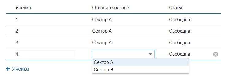 6. Чтобы добавить ячейки для адресного хранения, нажмите +Ячейка, введите ее название и выберите зону хранения в выпадающем меню.