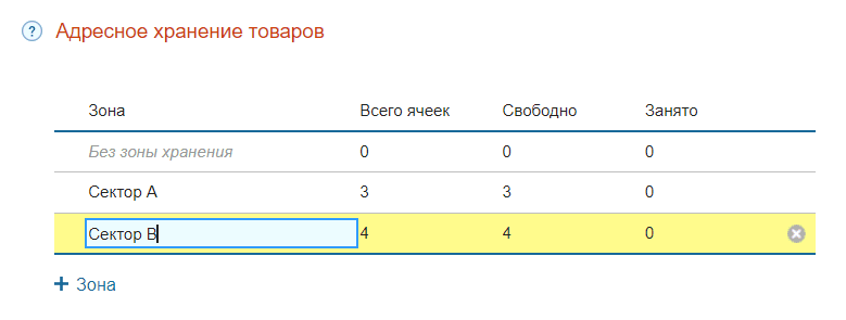 5. Чтобы разделить склад на зоны хранения, нажмите +Зона и введите ее название. Зону хранения можно переименовать и удалить. Для склада можно создать не более 10 зон.
