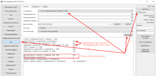 - Если данные не отправляются, закройте Тест драйвера, перезапустите ККТ по питанию и снова повторите шаги 2, 7.