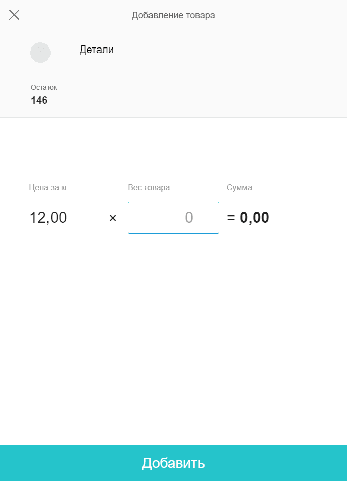 При добавлении весового товара необходимо указать вес. Для удобства работы с весовыми товарами подключите весы — тогда вес будет определяться автоматически.