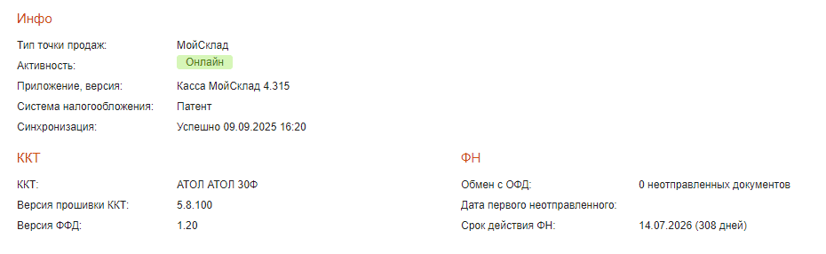 - Синхронизация — время и статус последней синхронизации Кассы с МоимСкладом. Время может не совпадать со временем последней активности. Например, когда точка активна и выходит в сеть, но синхронизировать нечего.