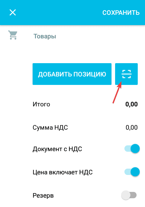 3. Прокрутите вниз до раздела Товары. Нажмите на иконку сканера справа от кнопки Добавить позицию. Откроется окно сканера.
