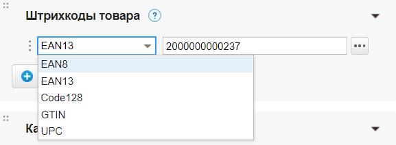 2. В разделе Штрихкоды товара выберите тип штрихкода из списка.