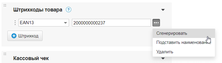 3. Введите штрихкод вручную или отсканируйте. Также можно сгенерировать новый. Для этого нажмите на три точки и выберите Сгенерировать.