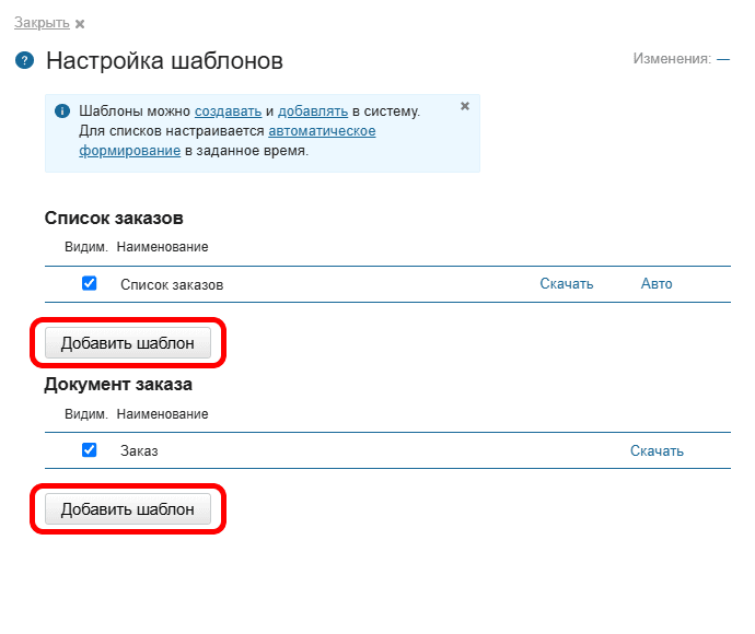 Нажмите кнопку Добавить шаблон в нужном разделе.